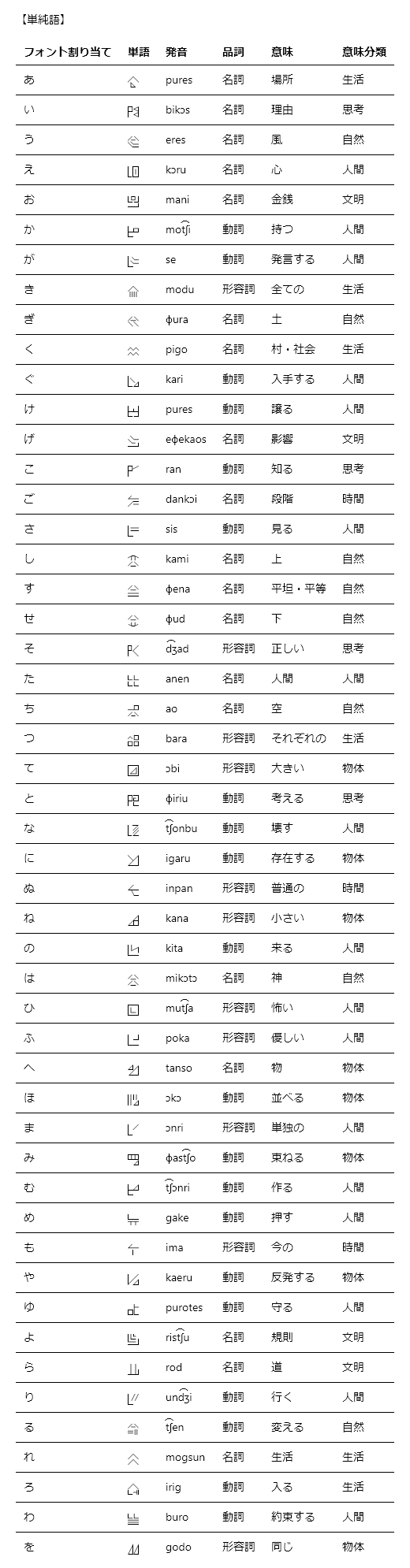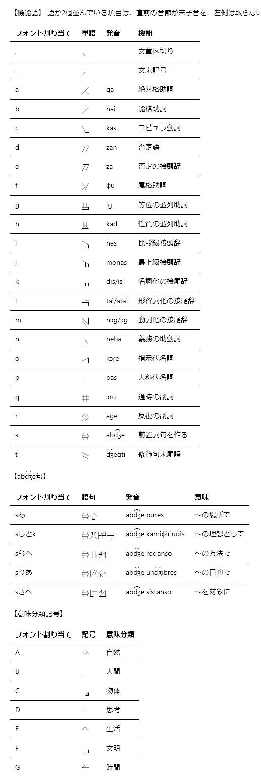 今回はパソコンでの取り扱いを楽にする目的で、自作表意文字をラテン文字とひらがなの領域に全て収めることとした。