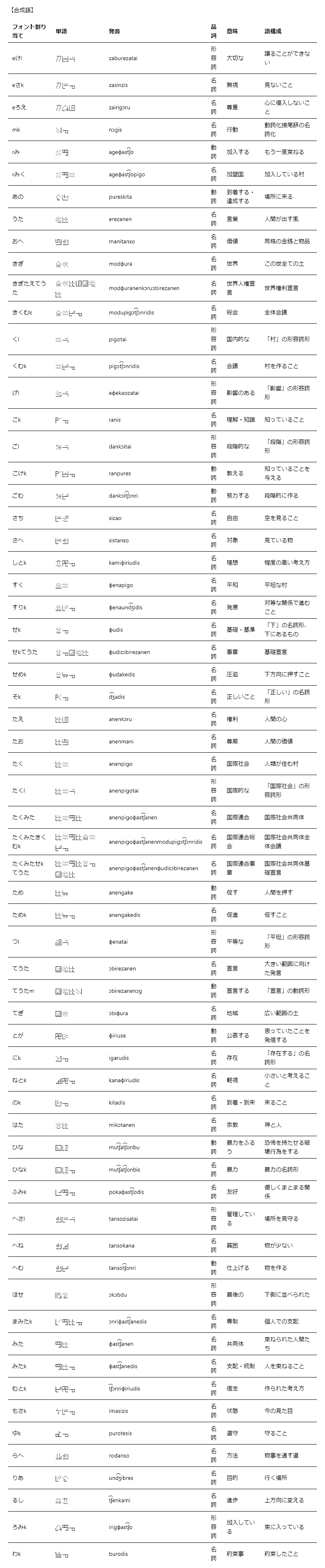 ただ、表意文字は合成語の文字数が極めて少ないというのは作っていて感じました。「国際連合総会」なんてIPAで書くと「anenpigoɸast͡ʃanenmodupigɔt͡ʃɔnridis」っていう何文字あるんだと言いたい長さですが、エレザネン文字では「たくみたきくむk」のフォント変更、たったの8文字です。この情報量の密度は表意文字ならではという感じがします。全然読めないけど。