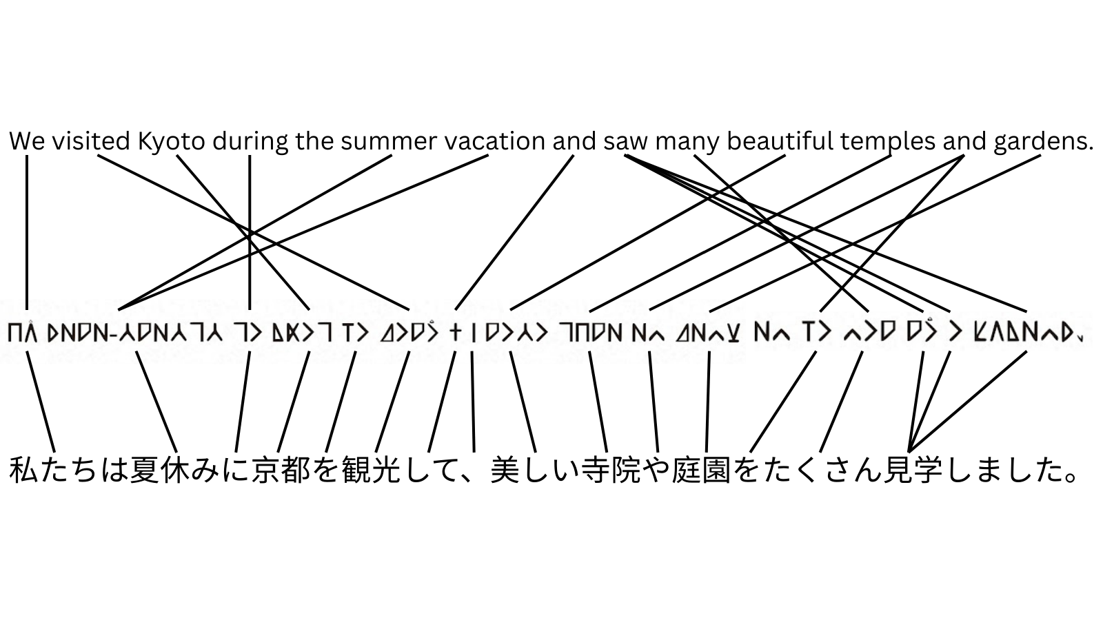 カディールの語順はSOVです。というか完全に日本語です。よく日本語と英語の対応する単語を線で繋げたら、やばいことになるじゃないですか、それがカディールはほぼ交わりません!日本語とカディールと英語を対応する言葉で繋げました。
