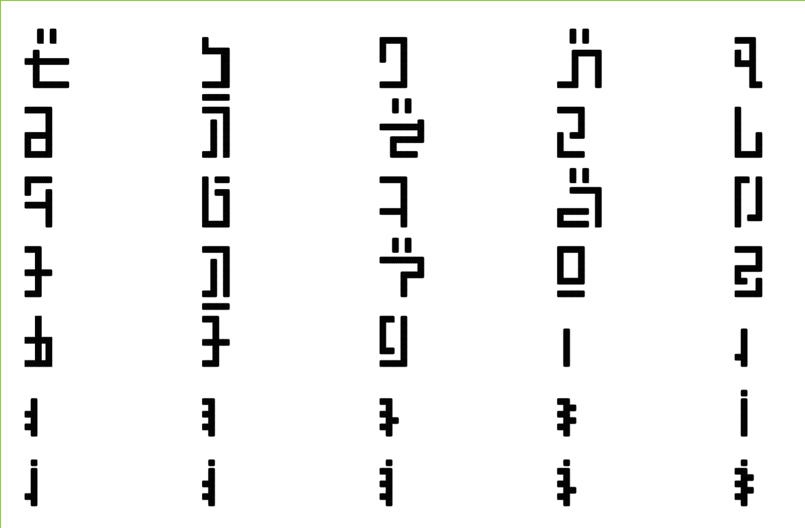 左上からa,b,d,e,f,g,th,i,j,k,l,m,n,o,p,s,t,u,v,w,h,sh,z,0,1,2,3,4,5,6,7,8,9,10,11に対応しています。