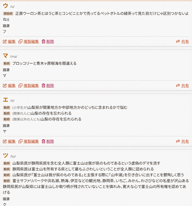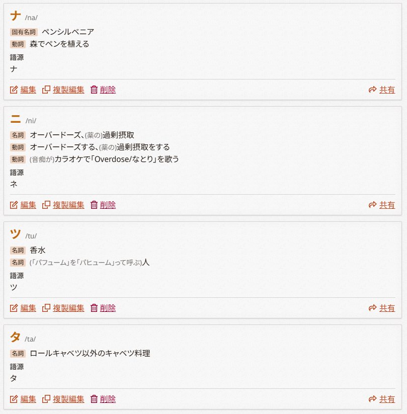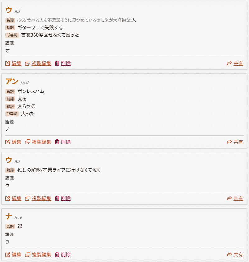 また、同じ音節の連続も許さなかったりで他にもいろいろな音韻変化があるんですが...めんどくさいので割愛します。(「割愛」なのでちゃんと「惜しい」とは思ってますからね~)