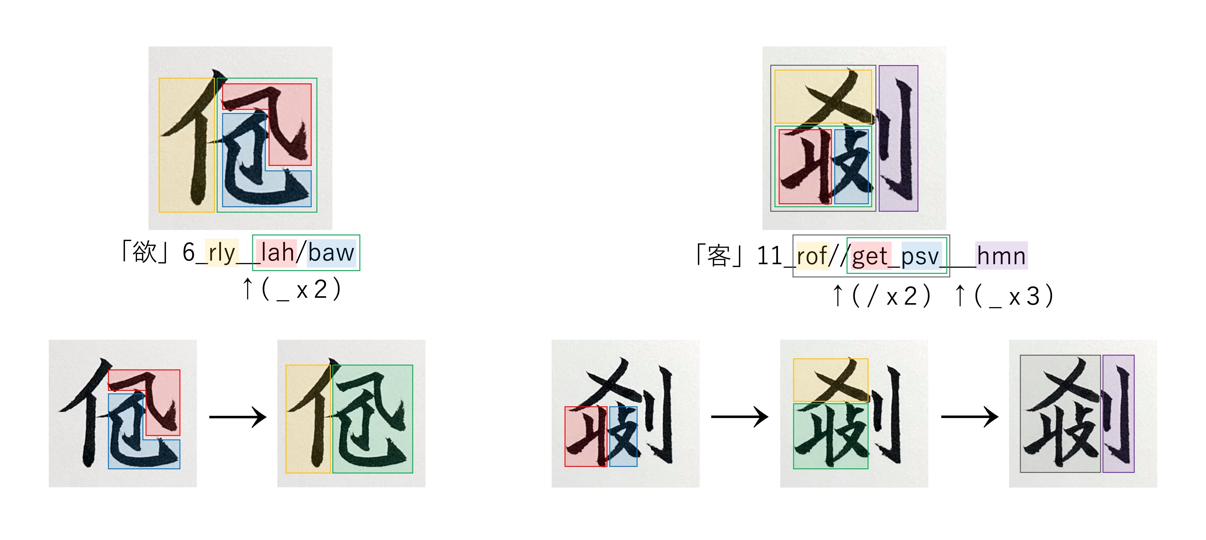 文字の構造が複雑な場合には、記号の数を増やして対応します。次の画像は「欲」と「客」について同じように色分けしたものです。