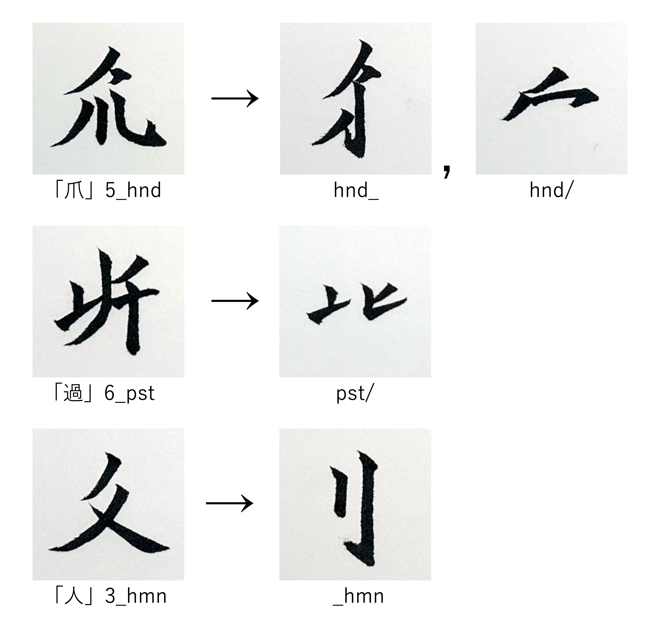 ただ、ここにも厄介な注意点があります。それは、文字によっては単体で存在する時と結合した時で形態が変化する場合があるということです。下の例では要素 hnd,pst,hmn が単独で文字として存在している時と、前後に記号( "_" , "/" )がついた時の形態の変化を示しています。