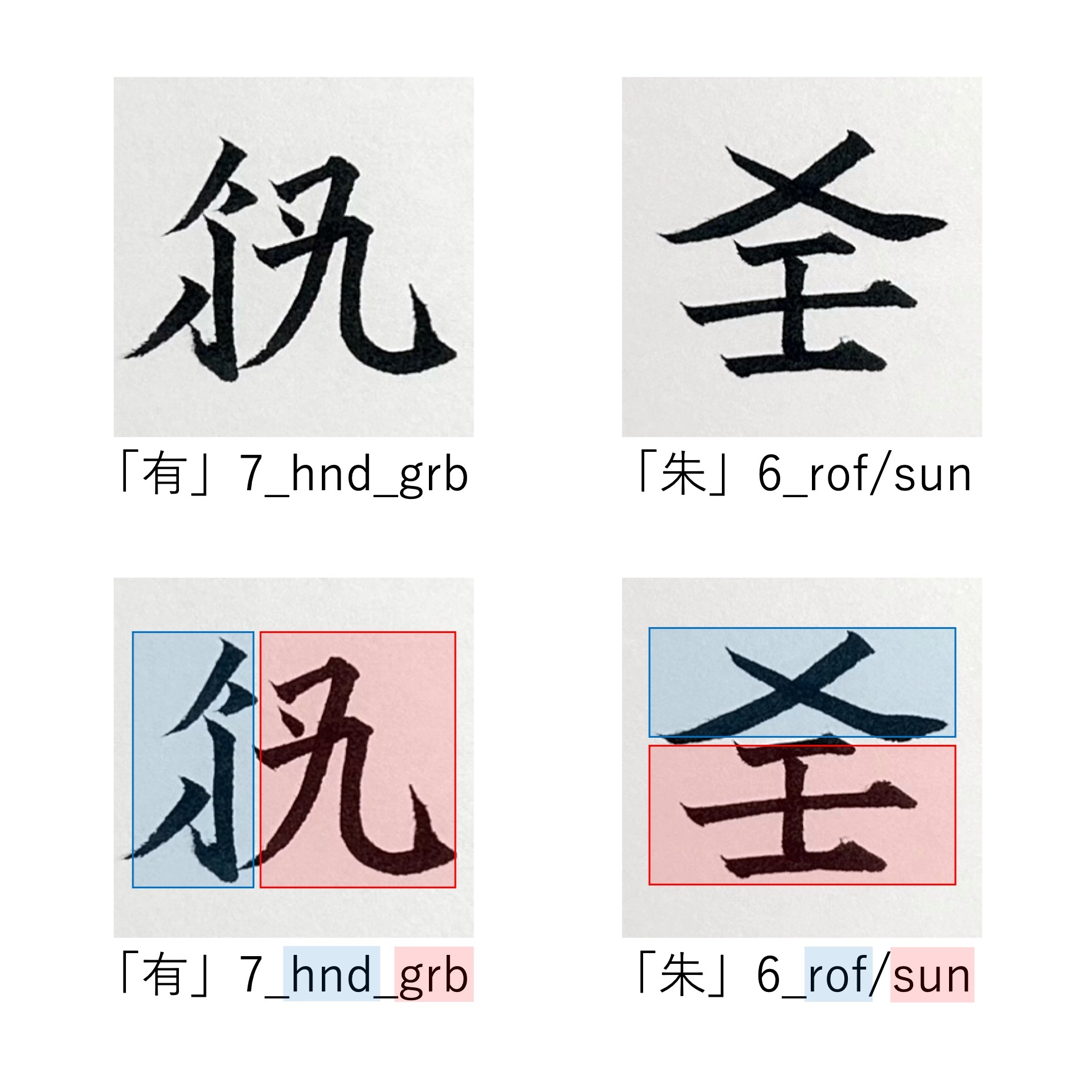 上の画像では「有」と「朱」という字を例に、字形とRSDcodeの関係を色を使って表現してみました。"_"と"/"は要素の位置関係を表しており、それぞれ左右の結合(⿰の配置)と上下の結合(⿱の配置)に対応しています。また hnd,grb,rof,sun はそれぞれ hand,grab,roof,sun という英単語から作られています。ね、簡単でしょ?