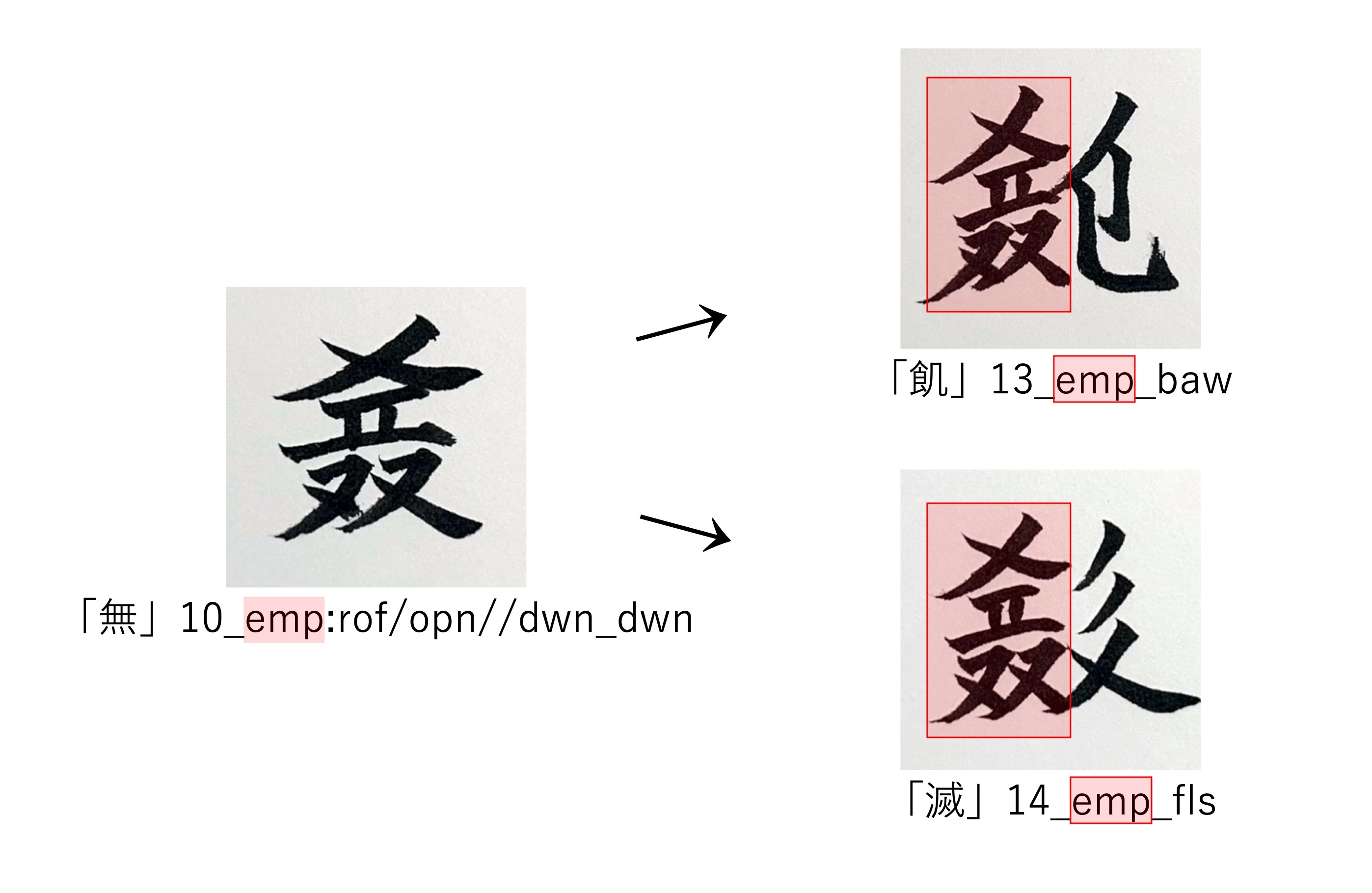 この例では「無」という字がその構造を保ったまま「飢」と「滅」の字に転用されています。「無」だけでも非常に長いコードを持っているため、それを毎回書くのは非常に面倒くさい...。そういった怠惰な効率を求める精神から生まれたのがこの記法です。