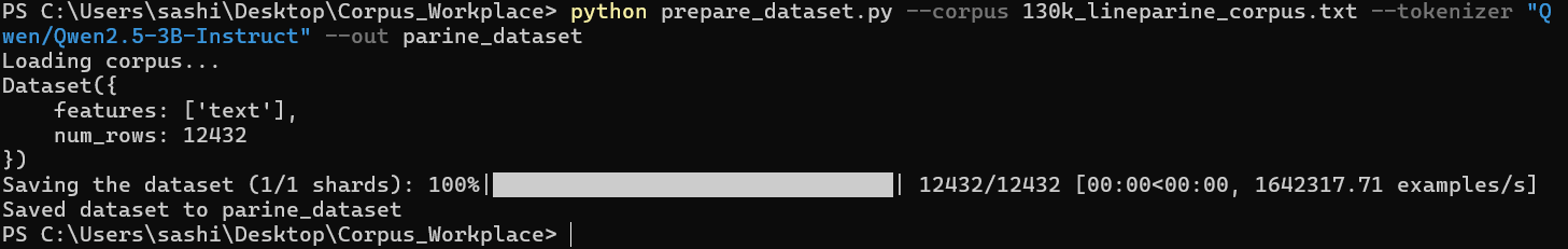 単純に行単位のコーパスを読み、トークナイズして HuggingFace datasets 形式にするスクリプト。