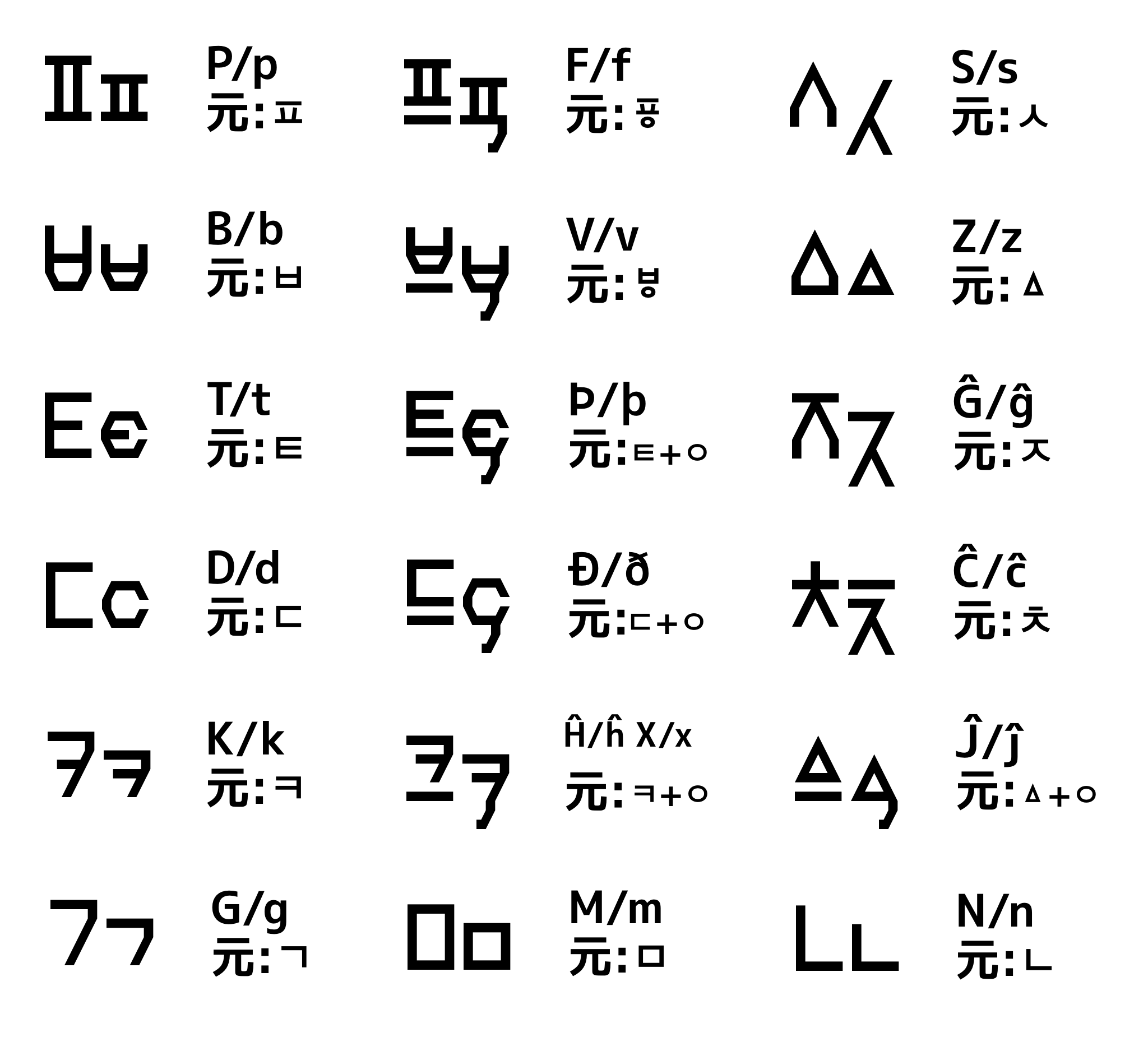 文字名は、「ハングル(Hanguel)」と「アルファベット(alphabet)」を足して、「ハングルファベット(Hanguelphabet)」としました